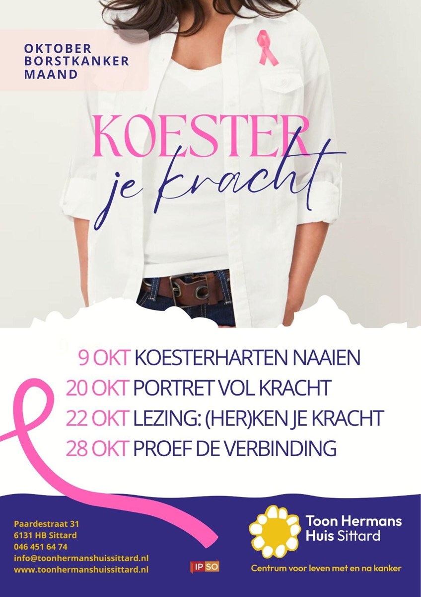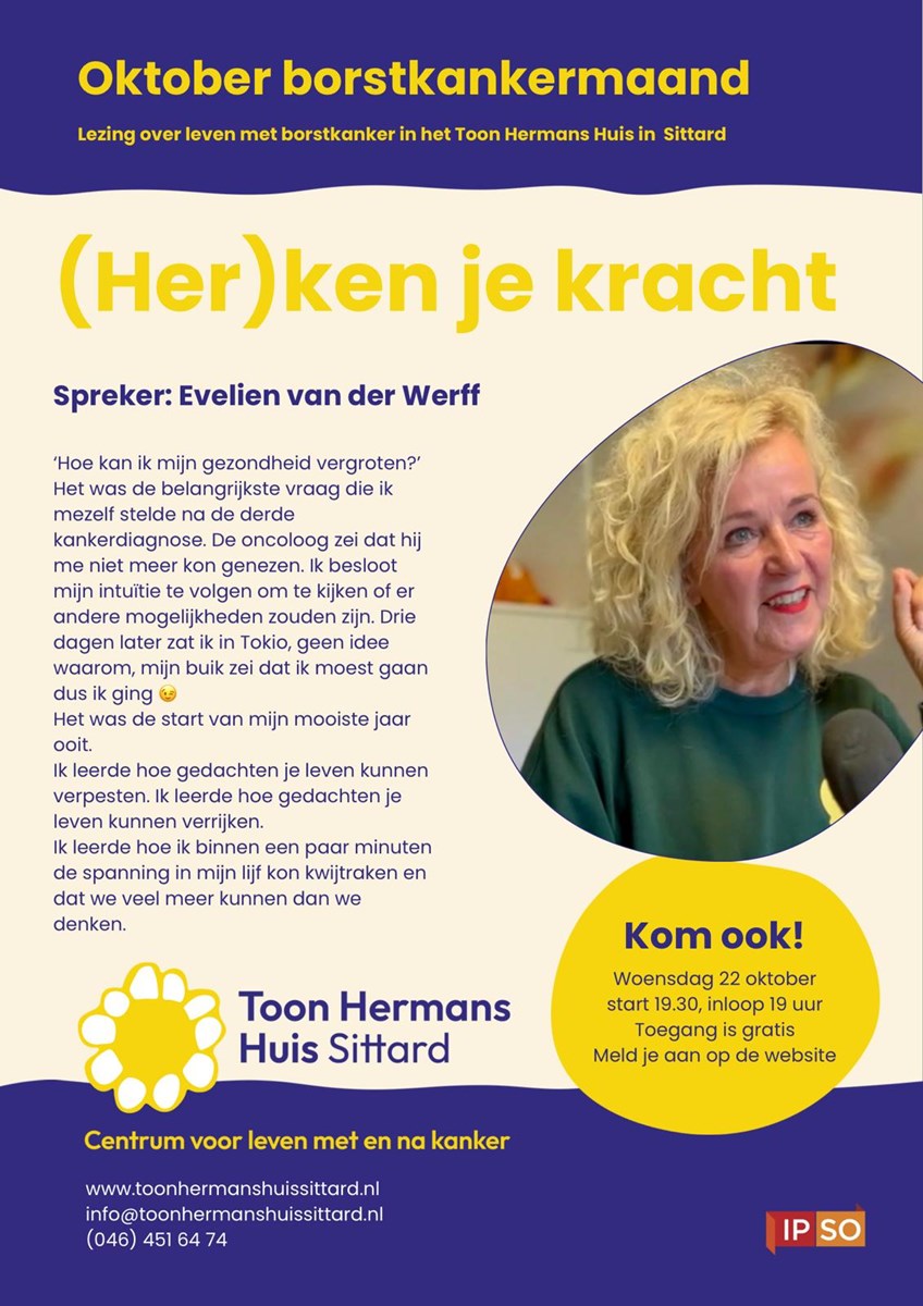 Tevens is er op Woensdag 22 oktober een lezing in het Toon Hermans huis in Sittard over leven met borstkanker. Toegang is gratis, wel graag even aanmelden op de website: www.toonhermanshuissittard.nl